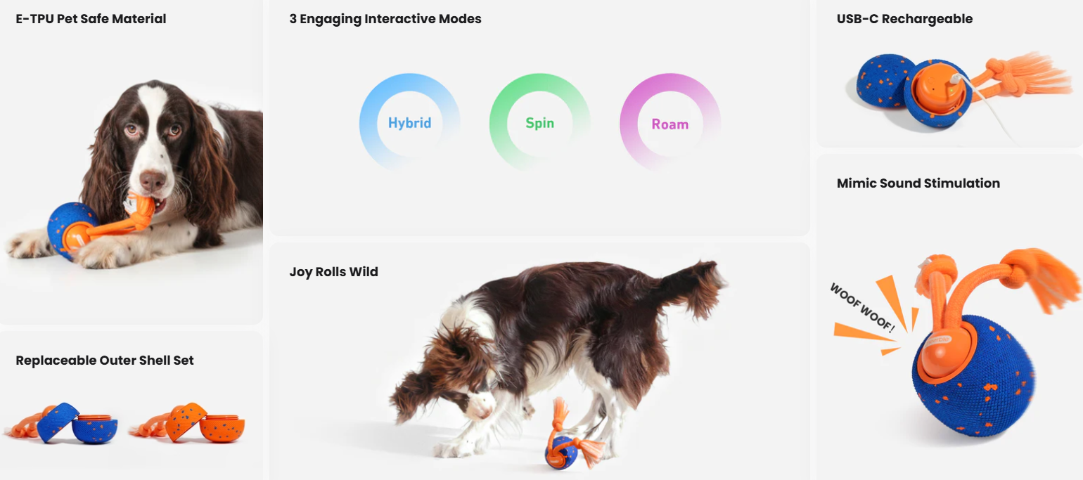 An interactive smart dog toy with E-TPU shell, 3 play modes, and replaceable cover for durable, safe, and fun pet play.